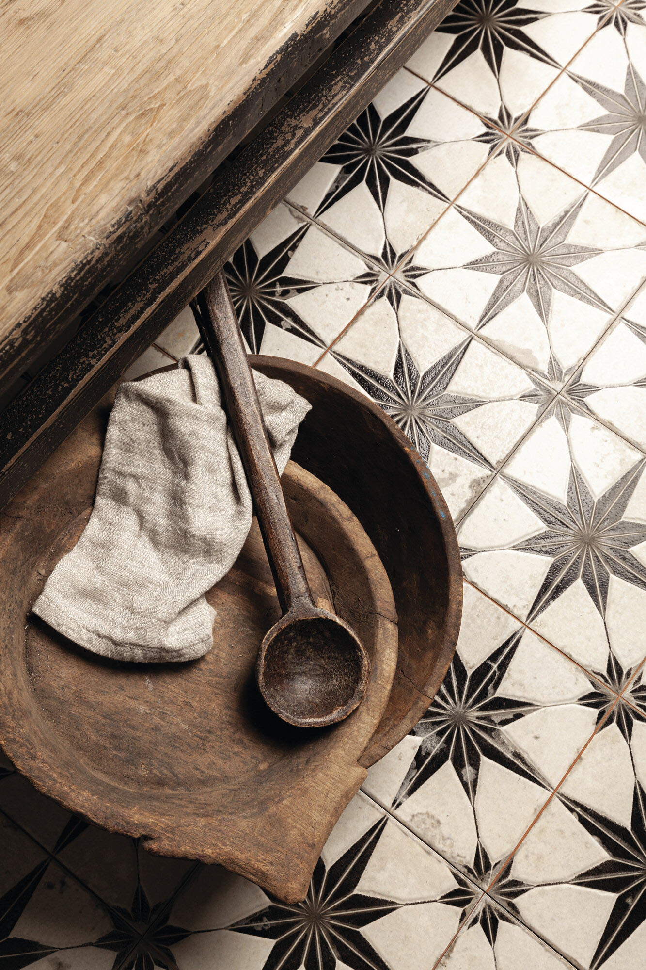 Fliesen in unvergleichlichem Used-Look, wie vom Lauf der Zeit geprägt.