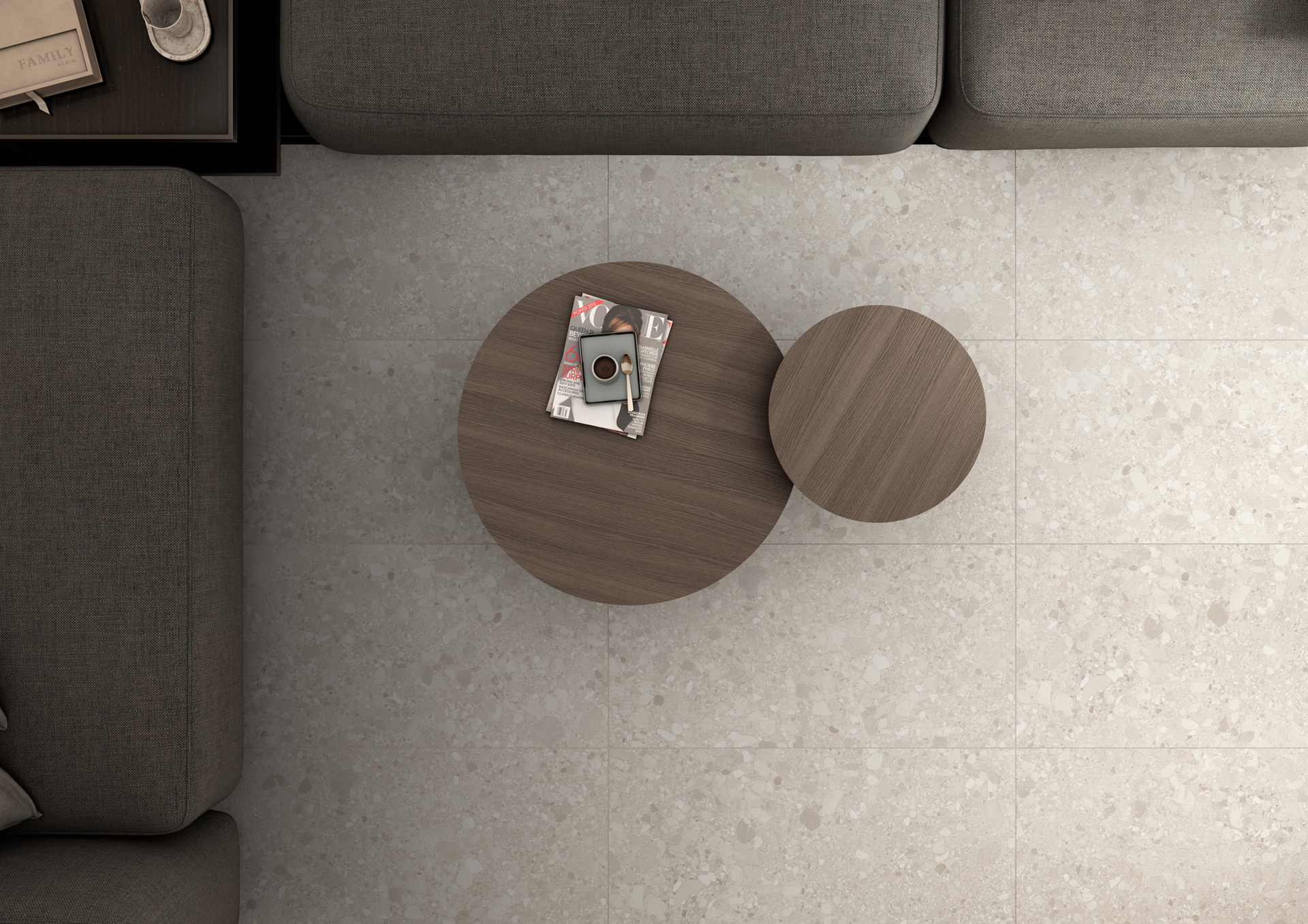 Jahrhunderte später hat sich viel verändert – doch Terrazzo ist geblieben. Heute ist er mehr als nur ein Boden: Er ist eine Bühne für Design, eine Leinwand für Licht, ein Fundament für Räume mit Charakter. Die Rohstoffe sind edler geworden, die Verarbeitung präziser, die Einsatzorte vielfältiger: Loft, Galerie, Boutique, Bad. Und mit der Serie Clemon 90x90 ist Terrazzo bereit für eine neue Generation von Räumen – großzügig, reduziert, kompromisslos schön.